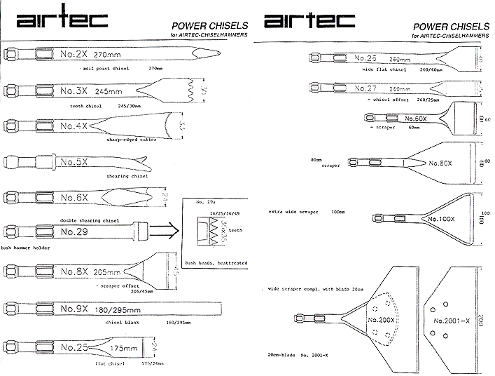 GREAT VARIETY OF SCRAPER CHISELS, EXTRA WIDE SPADE, AND NEEDLE SCALERS ATTACHMENT TO OPEN CRACKS QUICKLY.